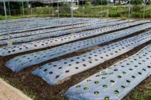 he Mulch Film is mainly used for Crops to restrain weeds, keep some pests away, and keep soil temperature cool. The most popular variant is Silver-Black mulch film. The upside of mulch colored in silver reflects sunshine preventing plants from pests. The black side of mulch downwards which can block the light, and restrain the growth of weeds. Color: Black & Silver It is Without Holl Mulch Film Width: 1200 mm / 1.2 meter / 4 feet Length: 400 meters 8 Roll per Acre Advantages of using Mulch Films: Saving in water consumption Weed control thereby saving on labor cost Pest control by 25% Earlier flowering Output increased Better fruit size Flower dropping is controlled during rainfall Control of fungal diseases Reduces Evaporation: Soil water loss is reduced under plastic mulch. As a result, more uniform soil moisture is maintained and irrigation frequency can be reduced thus saving on water and energy too. The growth of plants on mulch can be twice that of plants in unmulched soil. Because larger plants will require more water, however, mulching is not a substitute for irrigation. Early yields: The greatest benefits from plastic mulch film are that the soil temperature in the planting bed is raised, promoting faster crop development and earlier harvest. Black plastic mulch can give a harvest earlier by some 7-14 days, while clear plastic may advance the harvest date by 21 days. Fewer Weed Problems: Black & White-on-black mulches will reduce light penetration to the soil. Weeds cannot generally survive under such mulch. Thus, saving on weedicide expenses. Reduces Fertilizer Leaching: Excess water runs off the impervious mulch. Fertilizers are optimally used and not wasted. Reduced Soil Compaction: The soil under plastic mulch remains loose friable and well-aerated. Roots have access to adequate oxygen and microbial activity is enhanced. Root Pruning Eliminated: Cultivation is eliminated, except in the area between the mulched stripes. Weed growth in these areas can be controlled by cultivation or by the use of chemical herbicides. Cleaner Vegetable Produced: The edible product from mulched crops is cleaner and less subject to rot since no soil is splashed onto the plants or fruit. To keep plants, clean, they should be grown in a raised bed that is firm and slightly convex, with the highest point down the center of the row, while the plastic should be stretched tight to encourage the run-off of water. There should be no puddles on the mulched beds. Increases Growth: Mulch film is nearly impervious to carbon dioxide, which is necessary for photosynthesis. Research has shown that high levels of carbon dioxide may build up under the plastic because the film does not allow the gas to penetrate, it has to escape through the holes punched for the plants, and a “chimney effect” is created, resulting in abundant CO2 for the actively growing leaves. Aids Fumigation: Mulches increase the effectiveness of chemicals applied as soil fumigants. Because of the impervious nature of the plastic mulch it acts as a barrier to gas escape and keeps gaseous fumigates in the soil nicely. Reduces the Drowning of crops: Water is shed from the row area by the raised tapered bed so that excess water runs off the field, thus reducing drowning and other excess soil water stress.